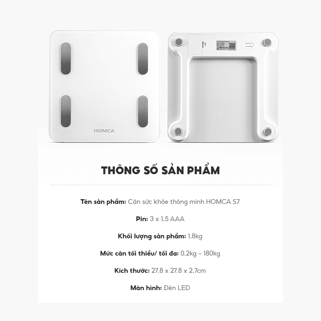 Cân điện tử thông minh HOMCA S7 đo 15 chỉ số, có kết nối bluetooth. Cân sức khỏe thông minh HOMCA S7 là một sản phẩm tuyệt vời để giúp bạn theo dõi và quản lý sức khỏe của mình, với công nghệ đo điện tử thông minh, thiết bị này có thể đo tới 15 chỉ số khác nhau bao gồm trọng lượng cơ thể, tỷ lệ mỡ, khối lượng cơ, xương, nước, chỉ số BMI, BMR, protein, tuổi cơ thể, nhịp tim… Các chỉ số này giúp bạn có cái nhìn tổng quan về tình trạng cơ thể của mình, từ đó có thể điều chỉnh chế độ ăn uống và tập luyện phù hợp.
