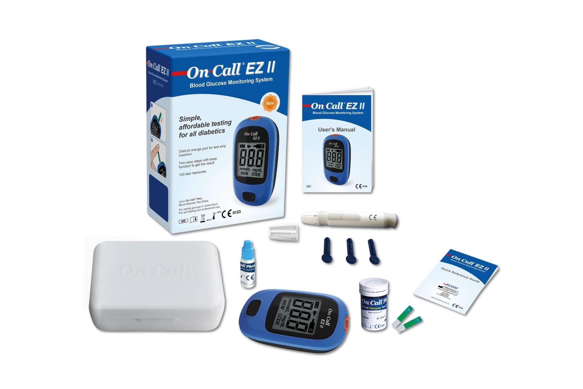 BỘ SẢN PHẨM MÁY ĐO ĐƯỜNG HUYẾT ON-CALL EZ II BAO GỒM: Máy đo đường huyết, que thử, chip mã số que thử, bút chích máu, nắp trong suốt, kim chích máu vô trùng, lọ dung dịch, bao đựng máy, hdsd, phiếu bảo hành.